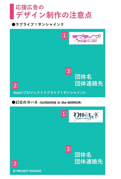 応援広告掲出にあたり「 ラブライブ!サンシャイン‼」「幻日のヨハネ -SUNSHINE in the MIRROR-」応援広告規程をよくご確認の上、遵守いただきますようお願いいたします。